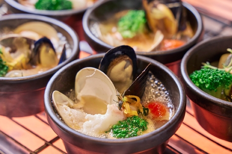 シェフが目の前で調理するライブクッキングは迫力満点。食欲をそそる香りと音が広がります。朝食、ランチ、ディナーまで、シェフ自慢の出来たてのお料理をお楽しみください。