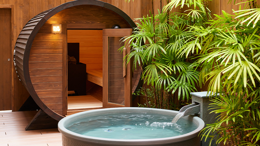 水風呂、そしてゆったりと外気浴できるチェアセットを備えたプライベートサウナ。